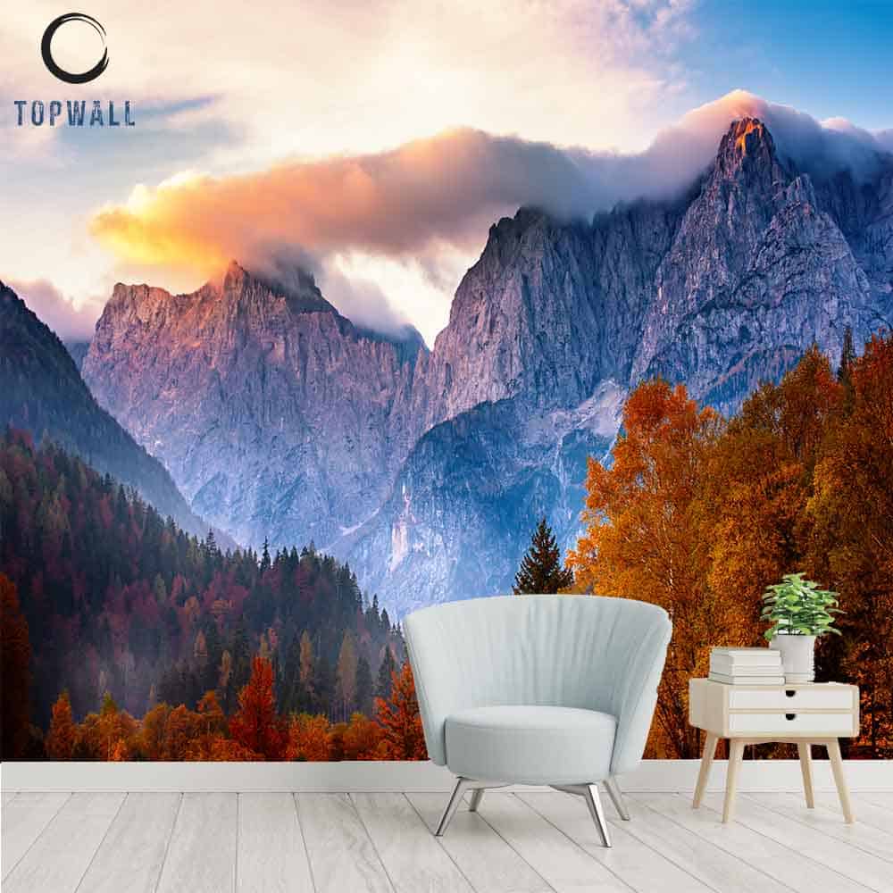 טפט תמונה מדהים של הרי געש בשילוב עצים, הטפט נותן תחושה של טבע בבית וחופשיות