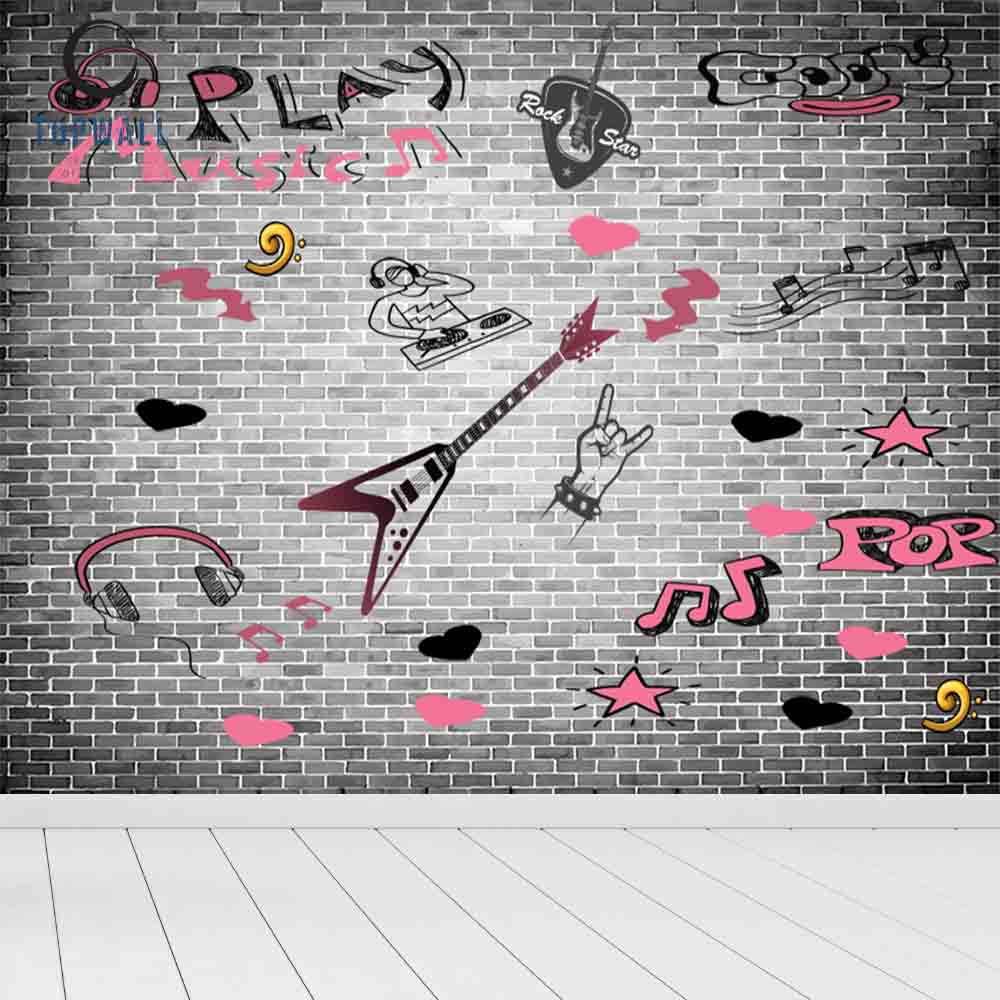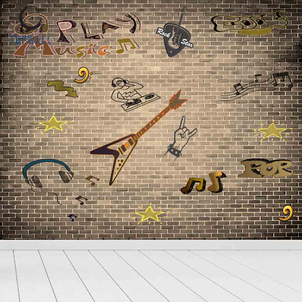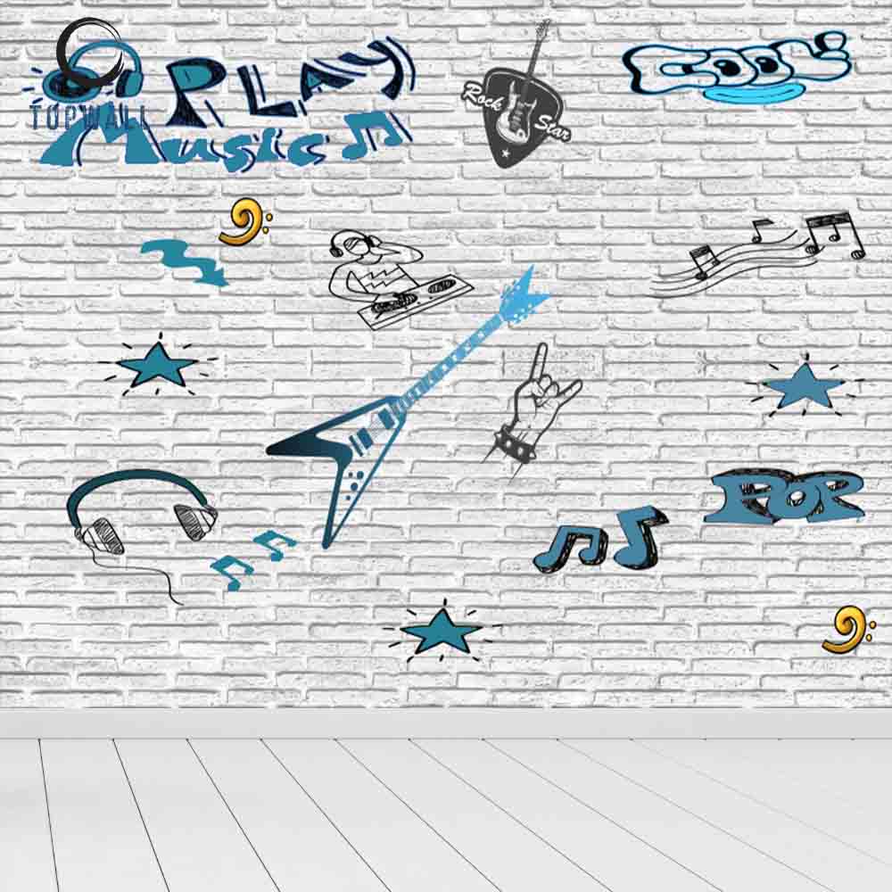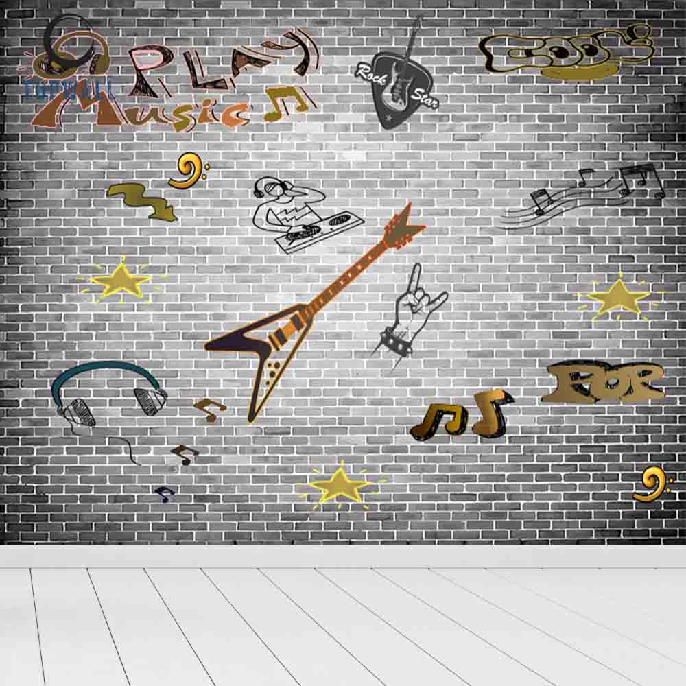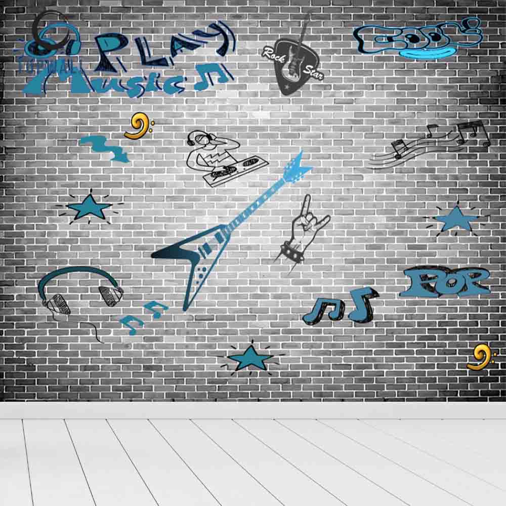 טפט מוזיקה כולל עיצוב גיטרה באמצע, מוקף באלמנטים מוזיקליים על רקע לבנים מיוחדות - בריקים בגוונים.