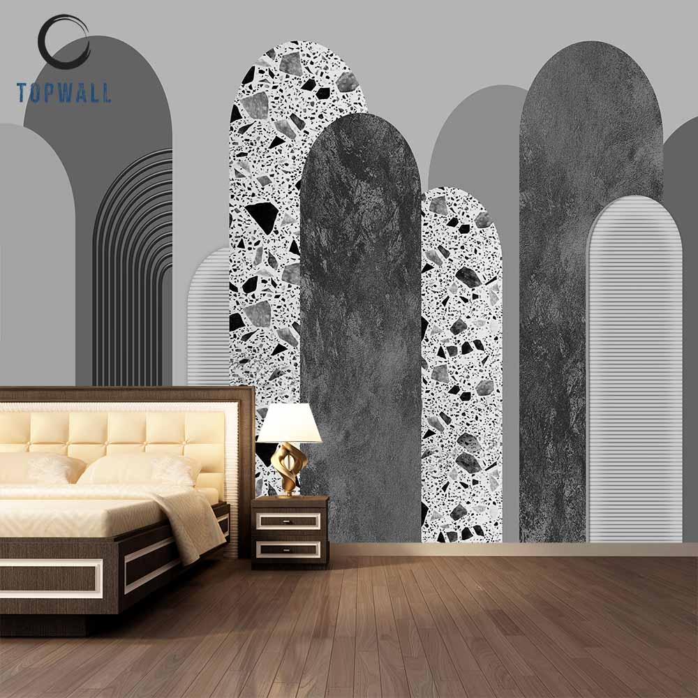 הטפט מציג קשתות מדהימות בסגנון רטרו שנותן תחושה של תלת מימד ומרחיב את חלל החדר.