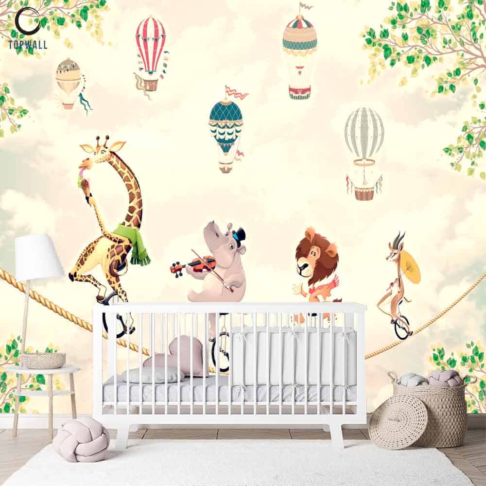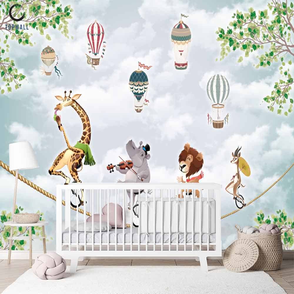 דגם חיות על חבל בשילוב כדורים פורחים היא הבחירה המושלמת לחיפוי קירות בחדרי תינוקות ילדים ונוער.
