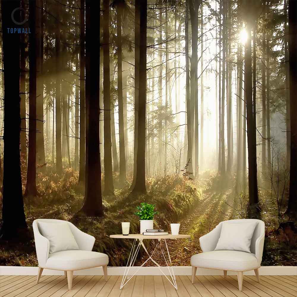 טפט תמונה- יער ושמש מבצבצת התמונה הפסטורלית מציגה את הטבע במלוא תפארתו -יער עם עצים גבוהים ועבים