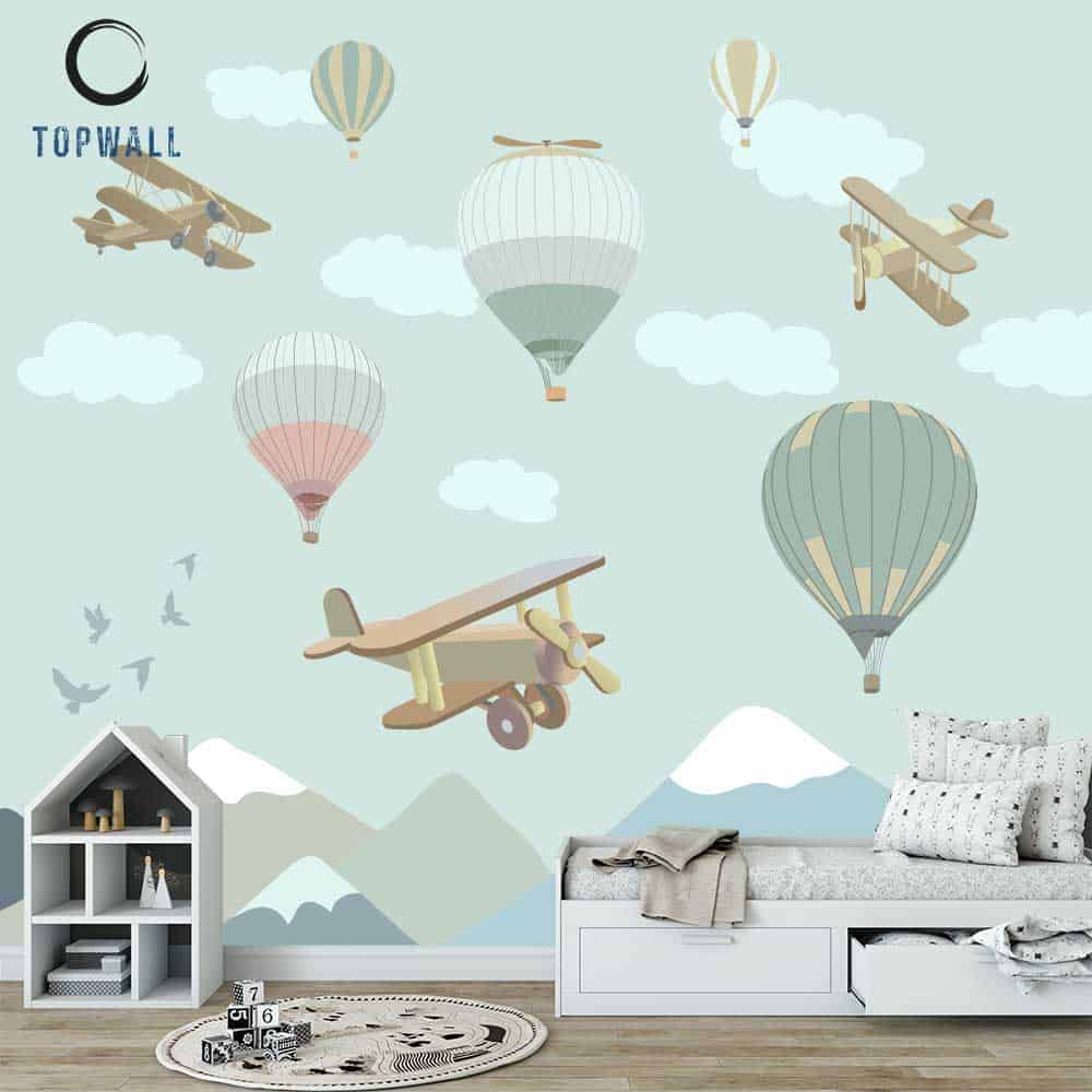 טפט תמונה עם אלמנטים של מטוסים וכדורים פורחים הוא הגשמה של חלום ילדות.