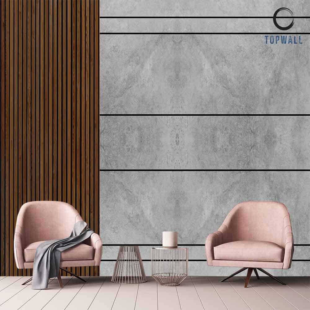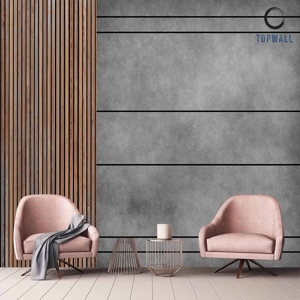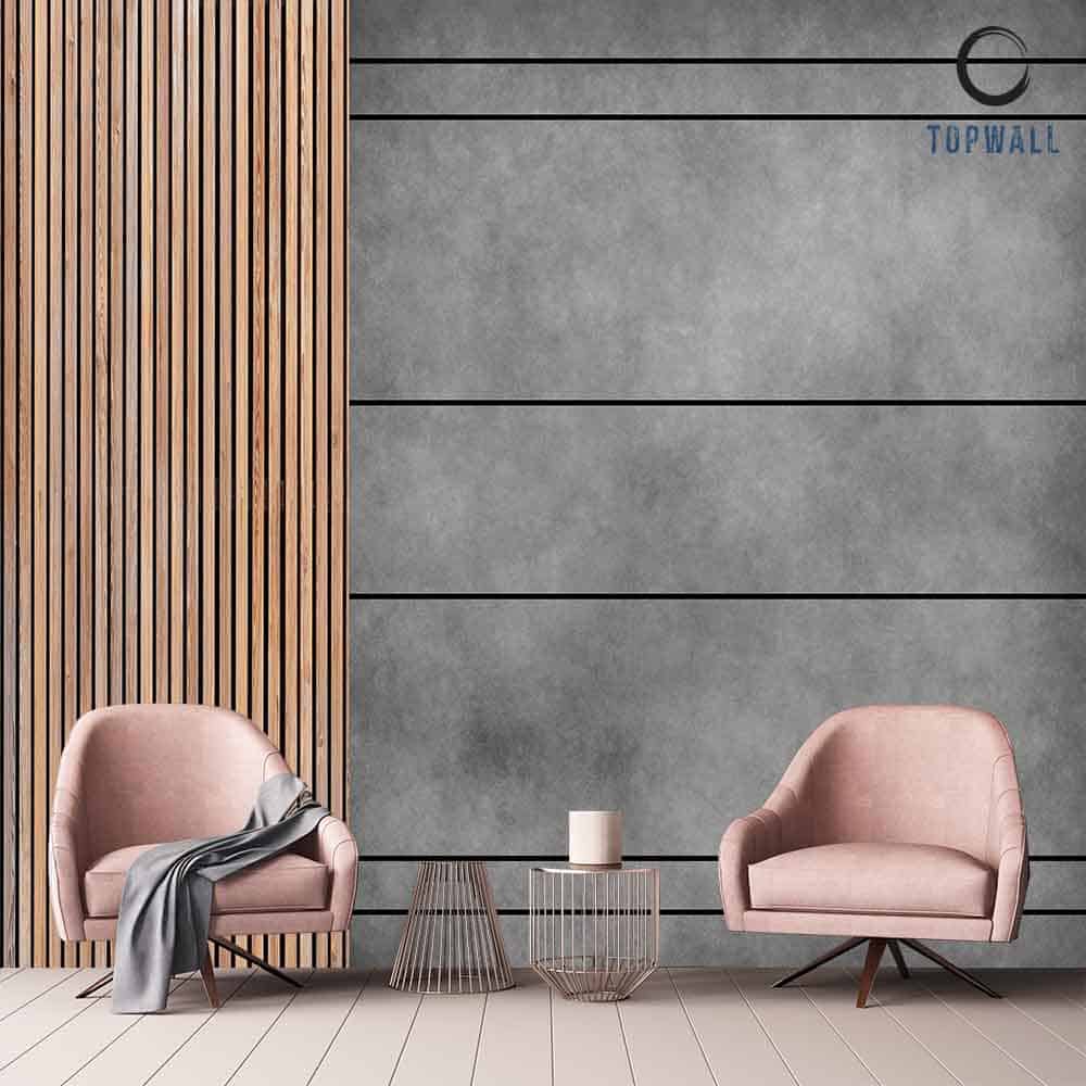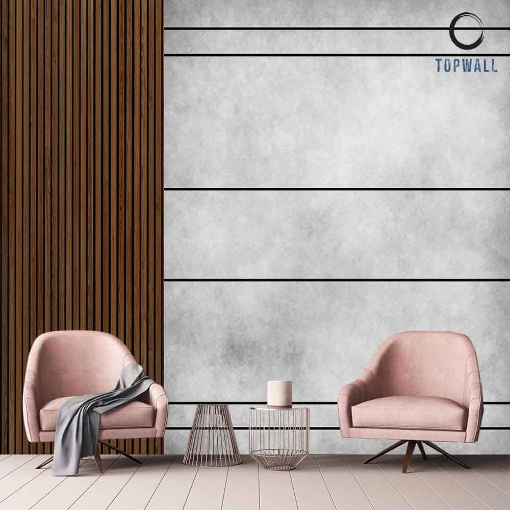 טפט ייחודי ועוצר נשימה של פסים א סימטריים על רקע דמוי בטון בשילוב לוחות עץ הוא ללא ספק השילוב המושלם.